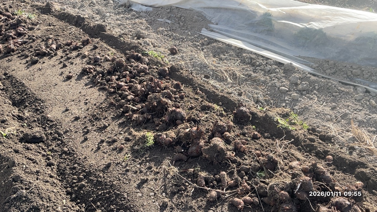 作業内容の整理 使用機械と作業方法: ∙ **振動式掘り取り機(PTO4)**で畝を砕いた後、**コンベア式掘り取り機(PTO1)**で収穫作業を実施 ∙ エンジン回転をアイドリングレベルに設定 ∙ 走行速度を時速0.3kmに調整 成功のポイント: 従来は時速0.5kmで作業していたところ、今回時速0.3kmに減速したことで以下の改善が見られました。 1. 掘り起こした土がヒッチ付近(機械の連結部分)に詰まらなくなった 2. 土がコンベア上でスムーズに処理され、作業の中断がなくなった 3. 海老芋への傷が最小限に抑えられた 4. 海老芋だけが畝の上に転がり落ちる理想的な状態を実現 今回の成果の意義 この発見は海老芋栽培における大きな前進です。振動式で畝を砕いてからコンベア式で丁寧に掘り取るという二段階作業に、適切な速度設定を組み合わせることで、収穫作業の省力化に目処が立ちました。