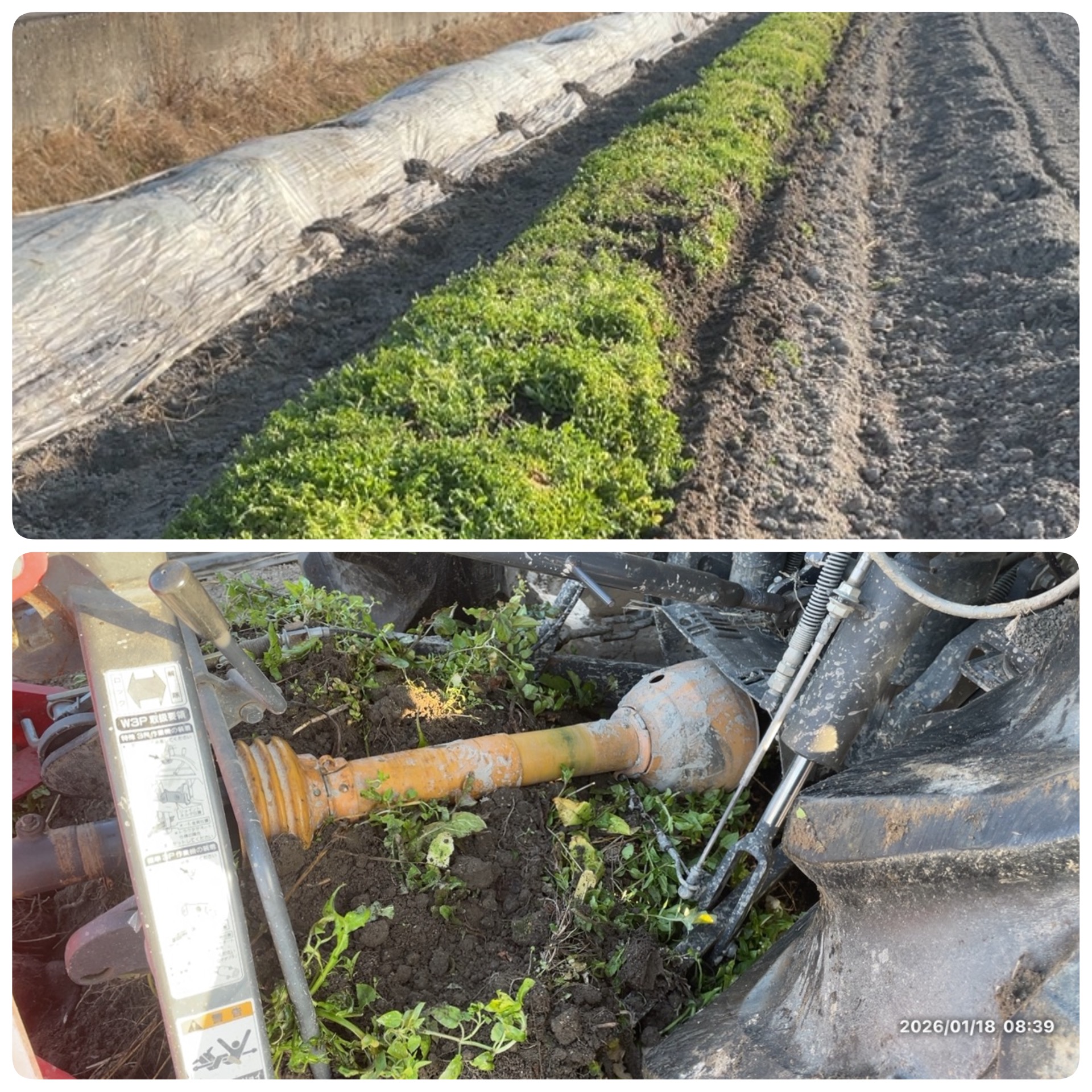 防寒用のビニールを取っていつも通り収穫作業した。 しかし草が結構生えているので、ベルト・コンベア式収穫器で収穫作業するときに必死に引っかかってしまう。 昼からもう一度振動式収穫機で、PTを4にして、土を砕いてからベルト・コンベア敷収穫期で収穫してみると、今度は土が引っかからず、土と草が引っかからず、無事収穫作業を進めることができた。このことがわかっただけでも大きな収穫だった。